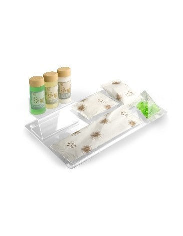 Bandeja acrílica translúcida de 15 x 26 cm para presentación de amenities. Fabricada en metacrilato transparente, es resistente, elegante y fácil de limpiar. Ideal para exponer jabones, botellas o kits de cortesía en hoteles, spas y alojamientos turísticos. Pack de 10 unidades. Jabones no incluidos.