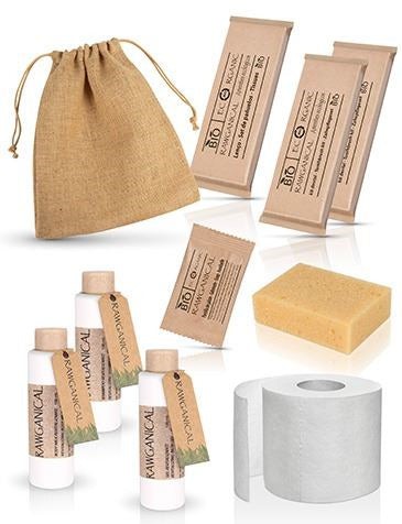 - Contenido: Bolsa de tela Bio, 2 sets dentales (cepillo y pasta de dientes), 1 set de pañuelos, 1 pastilla de jabón rectángular Bio 10gr, 1 esponja de baño Bio, 1 Rollo de papel higienico, 1 botella de gel de ducha Rawganical 100ml, 1 botella de champú Rawganical 100ml y 1 botella de Body milk Rawganical 100ml.