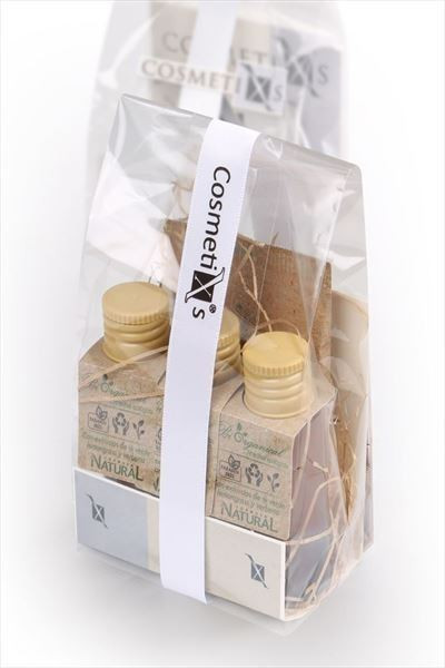 Set de Muestra Biorganical compuesto por gel de ducha, champú y body lotion y una pastilla de jabón.
